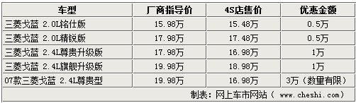 三菱戈蓝2.0L新车已经上市了,而销售境况却与之前的09款2.4L车型一样没有完全铺开。近日网上车市网站了解到,北京销售的09款戈蓝售价已经由前段时间的优惠8000元提升至现在1万元;而刚刚上市的2.0L戈蓝全系可给出5000元的优惠,另外部分商家还有07款的车型,直降3万元销售。具体详情如下: