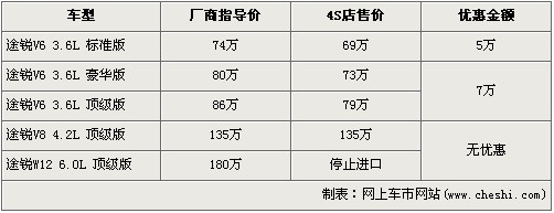 途锐是大众首款引进我国的SUV车型,在3.6L及4.2L率先上市后,大众为了满足消费者的更大胃口,紧接着又推出了搭载12缸发动机的6.0L车型。随着大排量消费税的颁布,给9月份后入关的大排量车型带来了一次不小的冲击,令大排量汽车价格都上调了不少。近日据网上车市价格系统监测显示,大众途锐的6.0L车型已经停止进口,并且购买目前购车可以得到最高7万元的优惠,具体详情请看下表: