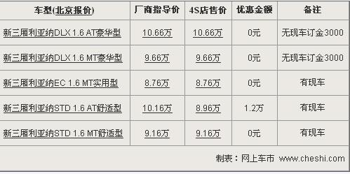 据昌河铃木4S店销售人员介绍,利亚纳三厢车型目前只有三款有现车,分别为手动实用型、手动舒适型和自动舒适型,其中手动车型暂时没有优惠,自动舒适型购车可以享受1万2的现金优惠。其他车型暂无现车,购车需预订,订金为3000元,预计一个月左右可以提车。