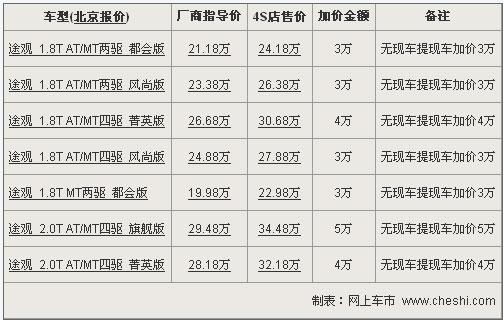 记者从上海大众4S店获悉,由于受到上海大众产能影响及庞大的订单影响,途观目前购车无法给出一个明确提车时间,并且在没有现车的情况下,还需加价3-5万元不等。途观按照配置不同加价有所不同,都会版及风尚版购车需加价3万元,菁英版购车需加价4万元,而售价最高的旗舰版车型需加价5万元。但消费者可以不必担心,如果交付定金后,等待时间较长,4S店可将定金完全退回。