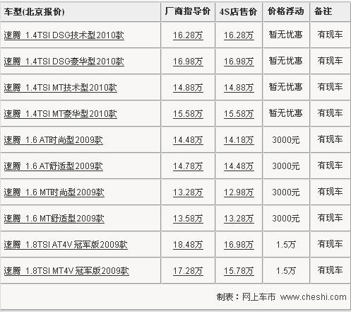 据4S店销售人员介绍:目前速腾全系最高优惠4000元。今年推出的1.4TSI车型首次出现优惠,最高降1000元,现车较充足,颜色也比较齐全。1.6升车型由原来的真皮版及天窗版改为时尚型与舒适型,售价也有相应调整,现1.6升4款车型售价分别为手动时尚型13.28万、手动舒适型13.58万、自动时尚型14.48万、自动舒适型14.78万,由于1.6升车型比较畅销,目前现车也不是非常多,所以优惠仅有3000元,颜色有灰色、白色、银色、红色等;1.8TSI车型相对较少,颜色也比较少,最高可优惠4000元。喜欢的消费者可根据自身使用情况而选择排量及车型。