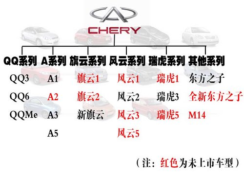 据奇瑞汽车销售有限公司副总经理刘宏伟先生透露,奇瑞品牌明年将推出多达五款新车,其中包括东方之子的换代车型,代号为B16;而且还会推出代号为M14的硬顶敞篷跑车;瑞虎系列车型也会在明年推出大改款;风云2两厢版预计会在明年年初推出市场;旗云1采用全新的市场定位,并且会在明年上市。今年奇瑞品牌将会超额完成销量目标,而明年的销量目标将在40万台左右。