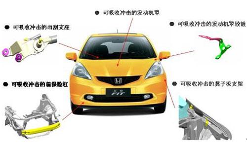 当行人与车辆发生交通事故时,最主要的死亡原因是来自于行人头部的伤害,而最主要的重伤部位是腿部。如下图所示,为了保护行人头部,飞度的发动机罩、翼子板支架等部位采用了碰撞吸能结构;为了保护腿部,保险杠的前部也采用了碰撞吸能材料。