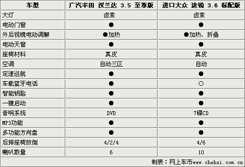 2009年5月25日,广汽丰田的首款SUV车型汉兰达正式下线,并宣布其正式上市。国产汉兰达车型分为2.7和3.5两个排量,共计10款车型,售价为24.88万元-42.98万元。汉兰达在外型设计上突破了传统的SUV设计风格的束缚,注重内在的力量而非粗放的外表,在坚韧的躯壳之上更追求智能化,同时它也是丰田在中国地区投产的首款中级城市SUV车型。那么它的市场竞争力究竟如何?和市场上其它中级城市SUV车型相比究竟有那些优势呢?为了能让您可以更加清楚地了解这款新车,我们选择了市场销售的进口大众途锐与其来做一个全方位的对比。这两款车型无论从车身尺寸,还是动力系统均属于一个级别的SUV车型。