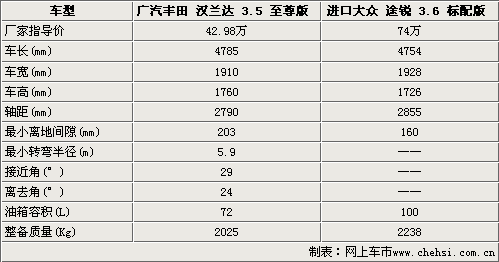 广汽丰田汉兰达和进口大众途锐均属于一个级别的城市SUV车型,我们选取的两款车型均是3.5排量这个级别的车型,但是在售价方面却相差了31万元。在车身尺寸方面,国产汉兰达在车长、车高、均超过了进口大众途锐,这一点保证了其内部头部空间的宽敞。在轴距方面,进口大众途锐要比广汽丰田汉兰达长出了65mm,这一点意味着途锐的腿部空间将会优越于汉兰达。在越野性能方面,从上表数据可以看出汉兰达的离地间隙分别达到了203mm,接近角和离去角分别达到了29°和24°,这样的参数应该可以满足一般的越野路况。越野方面进口大众途锐没有提供越野参数数据。进口大众途锐的油箱达到了100升,使您完全没必要去考虑长途旅行没油的问题。