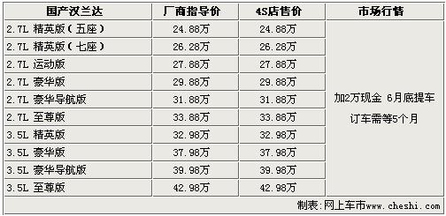 2009年5月25日,广州丰田正式推出了SUV车型汉兰达,售价24.88—42.98万元。作为一款日系经典SUV车型,这款车以进口方式销售时就得到了广大消费者的喜爱,此次国产后的汉兰达增加了2.7升排量的车型,不仅使车系的价格较进口车型降低不少,而且还增加了消费者的选择空间。目前国产汉兰达的现车还没有到店,急于提车的消费者需要加价提车。