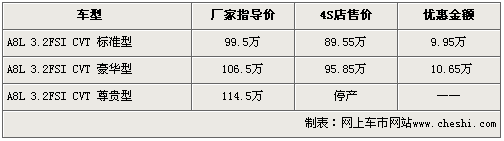 据4S店销售人员介绍,奥迪A8L 3.0车型已于日前正式上市,但由于该车型为原装进口,所以预订周期为6个月,且订金为10万元。另据该销售人员表示,目前奥迪A8L 3.2车型除尊贵型停产外,其余两款车型均有大幅优惠。其中奥迪A8L 3.2优惠幅度达10.65万元,而入门级车型优惠后售价仅为89.55万。
