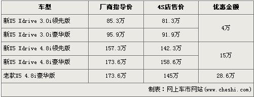 宝马全新X5于去年7月上市,此车的上市为竞争激烈的高性能运动型多功能车(SAV)细分市场再次在操纵灵活性方面制定起新的标准。全新宝马共有3.0L及4.8L两个排量选择,价格区间为83.7万元-173.6万元。近日根据网上车市价格检测系统显示:宝马X5全系最高优惠金额达28.6万元,具体详情请看下表: