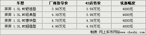 据长安轿车4S店销售人员介绍,奔奔目前现车都比较齐全,但与上月相比,优惠幅度明显有所减少。目前奔奔1.3L四款车型只能优惠4000元,比上个月少1000元。但销售人员也表示,如果消费者到店详谈,还可能有进一步优惠的余地。