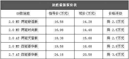 我们近日从北京地区的一家经销商处了解到,在稳定了一个季度之后,途胜的优惠再次增加,目前09款途胜全系车型的优惠增加到2.3-3.6万元区间,平均价格比一个月前下降了3000元左右,性价比再次得到提升。以下是09款途胜在北京地区综合经销商处的最新报价表:
