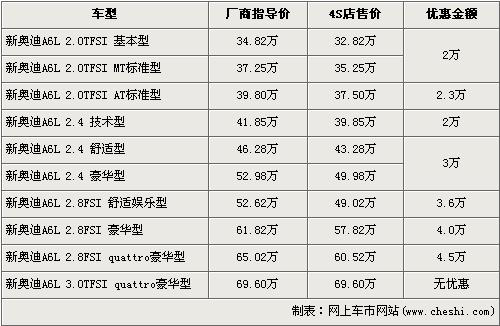 据4S店销售人员介绍,目前奥迪A6L全系可以最高优惠4.5万元。奥迪A6L全系分为2.0TFSI,2.4L,2.8FSI,3.0TFSI四种共10个车型,最低配的2.0TFSI基本型经2万元优惠后售价从34.82万元下降到了32.82万元,而2.8TSI quattro豪华版经全系最高的4.5万元优惠后售价也降到了60.52万元。全系最高配的3.0TFSI quattro豪华版目前店内没有现车,欲购买的消费者需要交1万元订金,约等3个月后方可提车。
