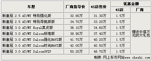 丰田汽车旗下的顶级车型——皇冠自2005年在国内投产以来,在市场中一直有着不错的口碑,而在上海车展中亮相的新皇冠更是吸引了国内众多消费者的关注,据悉这款车将于今年年底上市销售。据网上车市价格监测系统显示:目前购买老款皇冠的消费者最高可享受到1.5万元的现金优惠及厂商赠送的价值1万元的大礼包。