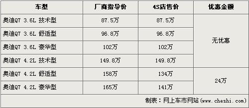 Q7是奥迪打造的第一款“高性能SUV”,同时也是奥迪引进中国的第一款顶级SUV车型。Q7凭借杰出的运动性、高超的操控性及冲击性极强的外形在上市时就获得了人们的关注。随着在上海车展亮相的改款新Q7即将上市,在售的老款Q7已经停产。目前在售的奥迪Q7出现了最高为24万元的优惠,具体详情请看下表: