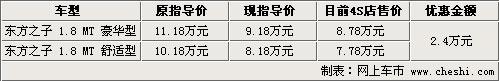 据销售人员介绍,奇瑞东方之子1.8手动舒适型和豪华型黑色有现车,其它颜色需要预定。售价在原有官方降价2万元的基础上,再优惠3000元~4000元。如果觉得现金优惠不划算,也可以选择在店内做装饰,还可以得到更多额外的优惠。