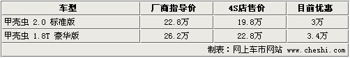 据4S店销售人员介绍:目前甲壳虫硬顶版本车型共有2款,2.0升与1.8T车型店内均有现车,2.0升车型目前颜色较为齐全,有绿色、红色、米色、黑色、蓝色车款,最高可优惠3万元,1.8T车型指导价改为26.2万元,优惠后仅为22.8万元。