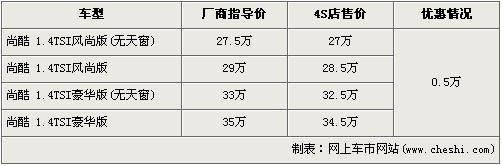 与高尔夫六代同平台的大众Scirocco尚酷轿跑车,自从广州车展上正式发布后,便引起了众多车友的关注。大众Scirocco尚酷轿跑车采用了大众IROC概念车的大量设计元素,激进的外观给人留下了深刻的印象。大众Scirocco尚酷轿跑车分为1.4T和2.0T两种排量车型,先期上市的为1.4T车型。近日据我走访北京多家大众4S店得知,大众尚酷1.4T全系出现5000元优惠,具体车型价格请看下表: