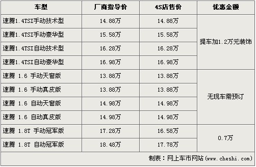据一汽大众4S店销售人员介绍,店内有速腾最新上市的1.4TSI车型现车,并且近期购买1.4TSI的消费者需加装价值1.2万元的装饰才可提车。1.6L车型全部没有现车,欲购买者需交订金1万元,约等2个月才可提车。近期购买1.8T车型的消费者可以得到7000元的现金优惠。