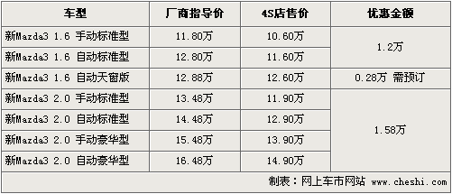 马自达3自4月份1.6L的自动天窗版车型上市以来,一直受到消费者关注。运动与操控完美结合让马自达3拥有较好的口碑。根据网上车市价格监测系统显示,马自达3现最高优惠1.58万元。具体行情如下: