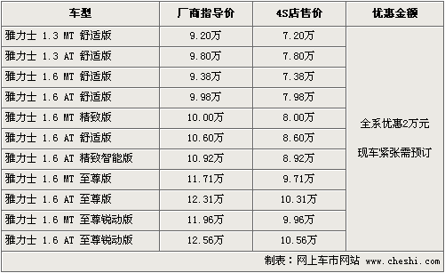 据广汽丰田4S店销售人员介绍,现在购买雅力士车型全系可以优惠现金2万元。目前雅力士现车紧缺,大部分车型需预订,2周左右时间就可以提到车。如消费者有意购买,到店详谈会有更优惠的价格。北京地区各4S店由于订单不同,各店销售的现车颜色有所不同。