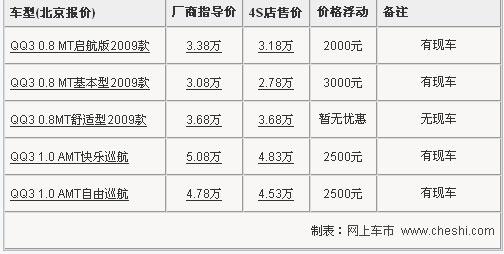 据奇瑞汽车4S店销售人员介绍,目前奇瑞QQ30.8排量的三款车型只有舒适版车型无现车,基本型和启航版车型分别有3000元和2000元的价格优惠,1.0自动档车型也有2500元的现金优惠。虽然降价幅度没有前一阵子大,但还有额外的惊喜,到店购车在原有现金优惠的基础上还可以赠送价值1000元的装饰。