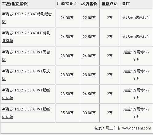 据北京一汽丰田4S店销售人员介绍,目前锐志全系优惠2万元,锐志 REIZ 2.5S AT特别纪念和2.5S AT/MT特别导航版有现车供应,且颜色较全,其余高配车型均需要预定。销售人员还表示:现车的颜色有银、白、黑、红可供选择,有现车的这两款车型是丰田锐志卖的最火的也是性价比最高的两款车型。消费者交定金1万等待1-2个月便可提车。北京地区各4S店由于订单不同,各店销售的现车颜色有所不同。