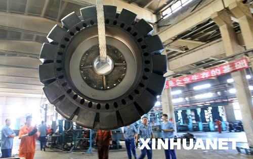 6月10日,在山东烟台中策橡胶有限公司生产车间,吊车将刚“出壳”的特大辐板式实心花纹轮胎吊起。