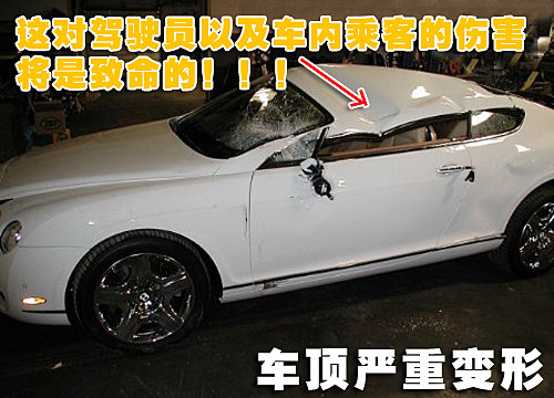 而这辆白色的宾利欧陆GT虽然车身损伤不是很严重,但是车顶部分已经完全塌陷。驾驶员位置车顶和座椅之间已经没有安全的空间,驾驶员存活的可能性较小,后排如果有乘客也将是“凶多吉少”。