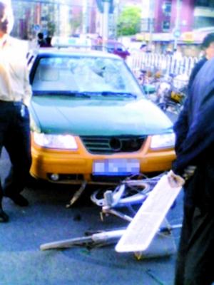今晨路过红庙路口北的市民李先生目睹了整个车祸经过。早上7时许,一辆由北向南行驶的出租车刚刚穿过红庙路口北的红绿灯,就与由东向西行驶的一名骑车男子当场撞上。“骑车人被出租车挑起后摔在挡风玻璃上又弹了出去。”李先生和很多路人都被这突如其来的一幕吓一跳。出租车的挡风玻璃被撞碎,变形的自行车被压在车下。而那名看上去30岁左右的男子趴在出租车南侧七八米远的地方,头部已经出血,一条腿不能动弹。