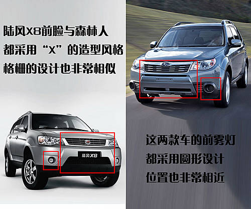 陆风X8的前脸与森林人非常相似,都采用“X”型的设计风格,而且前脸进气格栅的风格与森林人也非常相似。除了这些,陆风X8还配备了前雾灯,并采用圆形的设计风格,这也与森林人的造型相近。