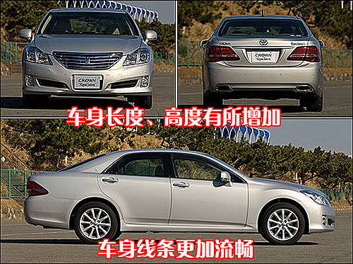 丰田新皇冠由于车身尺寸的增加,使得看上去更加大气。另外新皇冠车身线条较老款看上去更加流畅,前脸开口部左右分开,使第13代皇冠车型更加成熟、稳重。“乘坐舒适”一直是皇冠车型的优势,而丰田新皇冠在保持舒适性的同时还增加了车辆的运动性能。这款车的前脸设计更加精悍,尾部依然采用传统的多边形设计。