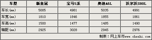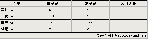 通过上表我们可以清楚的看出,丰田新皇冠车型尺寸与老款车型相比,长、宽、高分别增加了150mm、30mm和20mm。同时轴距也较老款车型加长了75mm。车身加大和轴距加长后得到的是更舒适的后排乘坐空间,车身变长对操控感会有一定的影响。