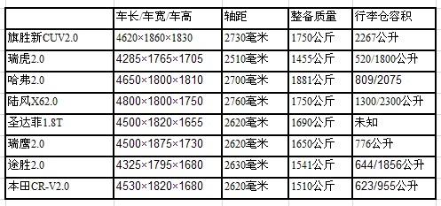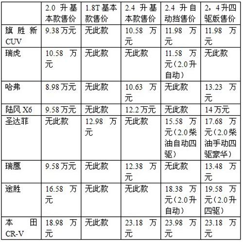 我们从厂家了解到,新旗胜已经全面上市,动力分为2.0升和2.4升两个系列,分为两驱和四驱共6个车型。外形看,这是一款颇为漂亮的车子,外形、做工和配置,与其售价很是不符。为了让大家对其有所了解,这里把新旗胜和同级的几款自主品牌SUV以及小一个级的SUV(比如瑞虎)做一番简单对比。为了参考的更全面,还把包括本田CR-V在内的几款合资车同时排列,尽管它们所面对的,并非同一个市场,特别是像本田这样的车型,与自主品牌相比,品牌价值差异较大,不能做直接对比,只能是个参考。