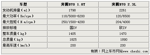 从B701.8T车型与2.3L车型动力对比来看,奔腾B70 1.8T以46Nm的压倒性优势战胜了在售的奔腾B70 2.3L排量版本,车身重量也较老款车型略轻,配备更强劲的动力后,车辆的提速、操控性能都会有很大提高。目前2.3L奔腾B70车型仍然在售,预计在正式推出奔腾B70 1.8T车型后2.3L车型将很有可能停产。