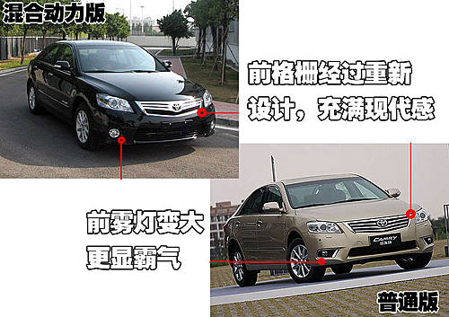与在美国市场销售的混合动力凯美瑞相比,即将在国内市场上市的这款车型在外观方面差别还是比较大的。美版混合动力凯美瑞采用了垂直设计的雾灯,接近平行四边形,蓝盈盈的前大灯以及虽然小巧,但很突出的隔栅。