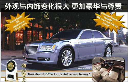 新克莱斯勒300C将会在明年迎来新的春天,新款车型在外观与内饰都有多处改进。据得到的一些消息称2011款300C会在燃油经济性上改进19%,而且在娱乐装备系统上也将会达到一个新的水平。马力上方面会有克莱斯勒的Phoenix V6发动机与HEMI V8发动机两种,高端的SRT8版本依然存在。在安全装备方面包括有盲区监测系统,ESC,能源回收型的转向柱,后侧车身加固结构等。