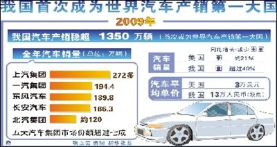 中国汽车技术研究中心首席专家黄永和10日对记者说,2009年中国汽车产销超过1350万辆,首次成为世界汽车产销第一大国。他预计2010年中国汽车产销会超过1500万辆,跨国汽车公司将从中继续受益。据新华社电