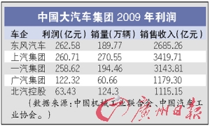 进入4月底,全球各大汽车企业2009财年(2009年4月1至2010年3月31日)财报相继发布,与此同时,中国机械工业联合会、中国汽车工业协会联合发布的“2009年度中国机械工业百强企业、汽车工业三十强企业”的统计数据显示,2009年汽车工业共有规模以上企业13758家,30强企业在企业总数中只占0.22%,主营业务收入却占62.98%,实现利润总额占60.72%。其中东风汽车、上汽集团和一汽集团2009年实现的利润为260亿元左右,广汽集团和北汽控股紧随其后,广汽的盈利超过100亿元人民币,大车企的吸金能力让人瞠目。