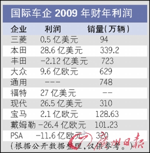 就拿现在全球风头“最劲”的大众汽车来看,2009财年的营业额超过1000亿欧元,但利润只有区区9.6亿欧元,利润率还不到1%,如果按其629万辆的销量来计算,每辆车的平均利润仅有100多欧元,大众去年全年的盈利恐怕还没有其在中国的两个合资企业一汽大众、上海大众的合计多。曾经是全球第一赚钱车企的丰田汽车受销量下滑和“召回门”的影响,2009财年预计出现2亿多美元的亏损;即使是国人看来利润丰厚的豪华车制造商戴姆勒-奔驰和宝马,日子也不是那么滋润。宝马集团去年在全球售出了近130万辆汽车,但只有区区2.1亿欧元的纯利润,而戴姆勒-奔驰更是出现了20多亿欧元的亏损。