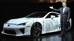 丰田社长丰田章男21日在东京车展上介绍新发布的高性能跑车“LFA”。