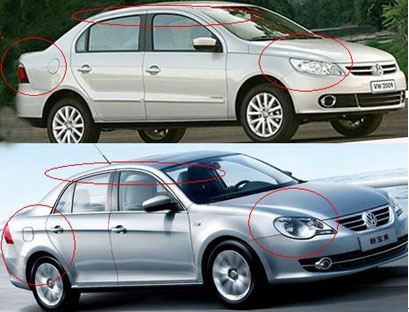 而新宝来的设计由于是德国设计师一手操办的,设计起来可谓得心应手,如果不是一汽在研发上的软肋耽误了时间,可能新宝来的推出时间要大大早于朗逸。仔细看新宝来的设计思路,有不少大众本身已有车型的影子,POLO、途安、EOS这些A0和A级车的影子都能在新宝来身上找到。但是似乎都不是特别像。一汽大众在公关宣传上将新宝来和EOS挂钩捆绑,无疑是在自己脸上贴金(就好比当初朗逸亮相时号称自己小辉腾一样)。实际上德国的这位设计偷了个小小的懒。如果大家注意到新的三厢高尔(两厢新高尔已经在巴西上市)的时候,将会发现,其前脸、尾部和侧面几乎惊人一致,特别是后门折线的地方,完全雷同。可以看出,德国人用了新三厢高尔的整体造型换了一个途安的大灯而已。也就是说德国大众的设计师是用一种传承现有A0与A级车经典元素进行混合的理念来设计新宝来的。这个设计理念旨在打造一款拥有多种经典要素的朴实无华的车型。
