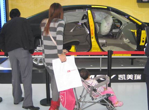 作为广汽丰田参展阵容的领衔车型,09款凯美瑞以其成熟的产品魅力吸引着众人的关注。这对父子就是被09款凯美瑞所特有的安全装备所吸引过来的。爸爸耐心地听着工作人员讲解09款凯美瑞新增加的VSC车辆稳定性控制系统、TRC牵引力控制系统和泊车雷达三项安全配置的功能,而小朋友正在专注地看着宣传手册,他认真的样子就好像一位高深的学者呢。
