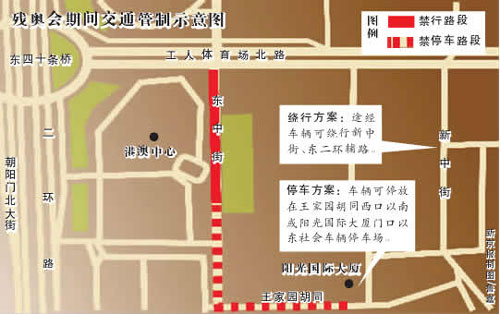 残奥会期间,残奥委员会官员住地总部(港澳中心)周边两路段禁止停车,东中街部分路段禁行。昨日(8月21日),北京市交管局发布残奥会期间交通管制的通告,临时性交管措施主要围绕港澳中心展开。