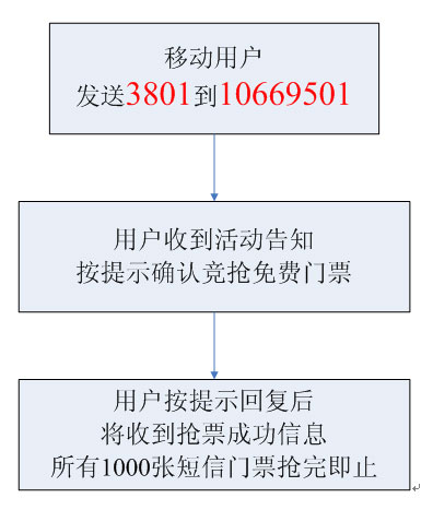 待移动用户收到活动告知后,可按手机提示确认竞抢免费门票,用户按提示发送回复后(1元/条,不含通信费),将收到以短信形式出现的电子票号,表示抢票成功。车迷朋友可以将短信保留至比赛日,只需在现场票务窗口出示该电子票号即可换领AGF赛事门票,享受正宗的方程式大餐(短信申请免费门票的流程如图所示)。