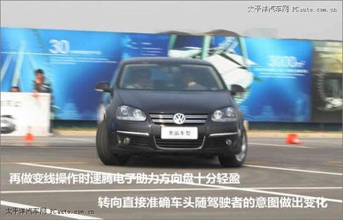 首先我们将速腾加速到80公里/小时,油门到底,车猛的窜了出去,再做变线操作时,电子助力方向盘十分轻盈,转向直接准确,车头随驾驶者的意图做出变化,只是在做出太大动作时,速腾的转向不足的情况比较严重。在整个过程中速腾底盘表现出深厚的功底,“驾驶者之车”的美誉名副其实。