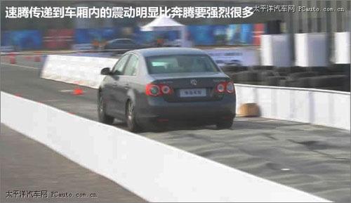 湿滑路面体验这个项目主要是模拟冰雪路面的对于车辆的操控,在光滑的钢板上泼上水附着力减小,在通过弯道时速腾依旧过早的出现转向不足的情况,不过方向盘的指向依旧保持的较为精准。奔腾在高速过弯时侧倾要小于速腾,不过路感不是特别清晰,电子稳定系统起到的作用非常明显,底盘在舒适性和运动性间找到了平衡点。