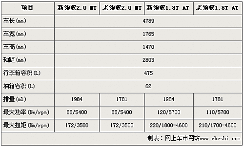 新领驭4789mm车长、1765mm的车宽、1470mm的车高以及2803mm的轴距均与老款领驭车型如出一辙,由此可见新领驭宽大的内部空间没有任何改变。在动力方面,新老领驭2.0入门车型和1.8T主推车型同样搭载2.0自然吸气四缸引擎和1.8T涡轮增压引擎。但新领驭搭载的1.8T涡轮增压引擎经过了重新调教,最大功率达120Kw,较老款领驭1.8T车型的110Kw高出10Kw。