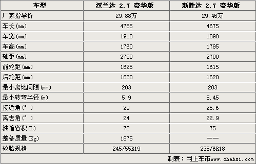 国产汉兰达和现代新胜达均属于一个级别的城市SUV车型,两款车型均是2.7排量的高配车型,售价相差了4200元。在车身尺寸方面,国产汉兰达在车长、车宽、均超过了现代新胜达,这一点保证了其内部横向空间及头部空间的宽敞。在轴距方面,丰田汉兰达比新胜达长出了90mm,这一点意味着汉兰达的腿部空间将会优越于新胜达。两款车型的离地空间都达到了203mm,确保了它们在复杂路面上的道路通过性。越野性能方面,国产汉兰达要优越于新胜达,这点从接近角和离去角的数据就可以看出来。丰田汉兰达的前后轮距和轮胎横截面数据都要大于新胜达,这表明在操控性能上汉兰达将会略胜一筹。汉兰达和新胜达的油箱均达到了75升上下,可以为其提供良好的续航能力。
