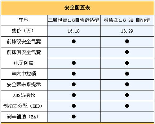 从上面表中我们看出,科鲁兹在被动安全配备上更出色,除了正面双气囊外还配备了侧面安全气囊,当车辆发生侧面碰撞时对驾乘者的保护要更到位。相比之下三厢世嘉只在更高的豪华型中配备了侧气囊,不过三厢世嘉的主动安全方面却比较完备,ABS+EBD+BA的组合完全可以应付日常紧急情况,而科鲁兹相对来说就有些单薄,甚至在当前经济型轿车都要配备刹车辅助系统的情形下,这项配备的缺失不能不说是一种遗憾!