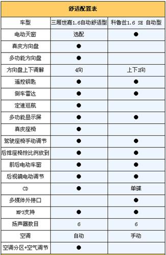 从上面表中我们看出,三厢世嘉舒适型不仅采用了真皮方向盘、真皮坐椅,而且标配了倒车雷达和定速巡航,这在同级别车型中还是少有的,如果你经常跑高速,定速巡航还是非常实用的。除此之外,三厢世嘉号称世界上最复杂的中央集控式方向盘整合了多媒体控制、定速巡航、空调控制、音量控制等功能,几乎可以让你做到手不离方向盘操作一切功能的程度。大大提高了行驶安全性。这一点是科鲁兹无法比拟的。