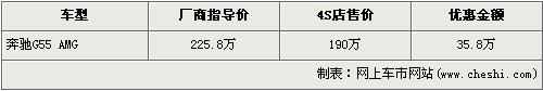 根据北京奔驰4S店销售人员介绍,目前奔驰G55 AMG现金优惠35.8万元。经优惠后,奔驰G55 AMG售价从厂商指导价的225.8万元下降到了190万元。销售人员还介绍,目前店内无奔驰G55 AMG现车,欲购此车的消费者需交订金10万元,最早2个礼拜可提车。
